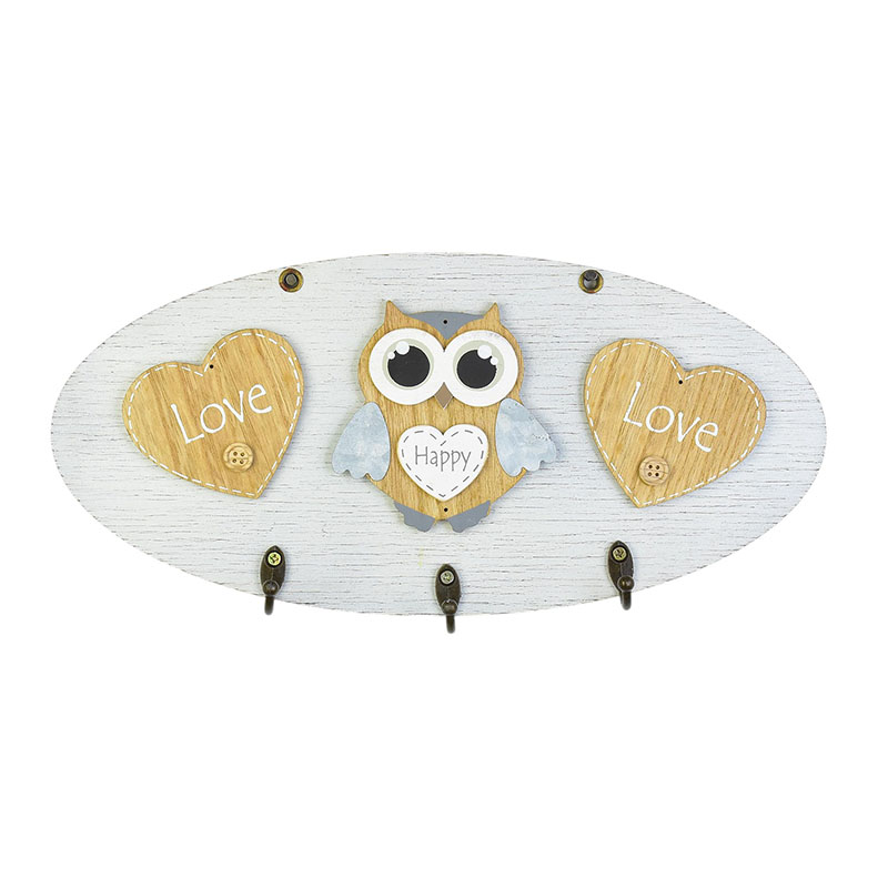 Cabideiro 3 Ganchos Coruja e Coração Branca em Madeira