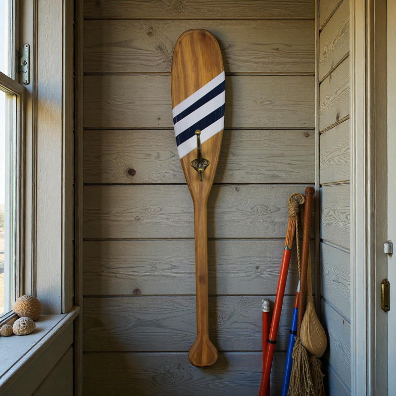 Charmoso cabideiro em formato de remo, com acabamento em madeira e faixas coloridas que trazem um toque náutico ao ambiente. Ideal para halls de entrada, banheiros, varandas ou áreas de lazer, une funcionalidade e decoração com estilo. Possui gancho metálico para pendurar chaves, toalhas ou pequenos acessórios.