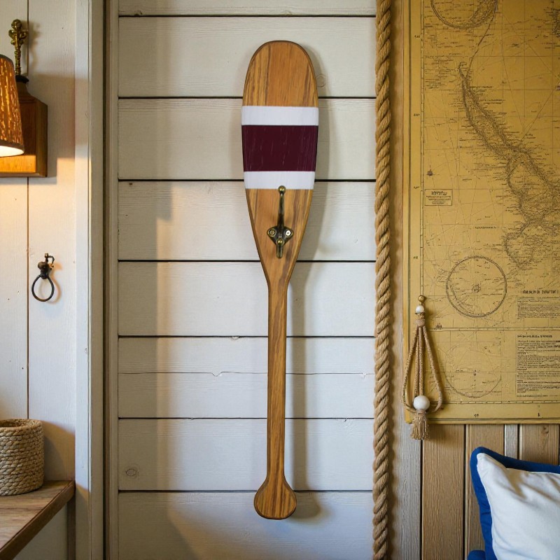 Charmoso cabideiro em formato de remo, com acabamento em madeira e faixas coloridas que trazem um toque náutico ao ambiente. Ideal para halls de entrada, banheiros, varandas ou áreas de lazer, une funcionalidade e decoração com estilo. Possui gancho metálico para pendurar chaves, toalhas ou pequenos acessórios.