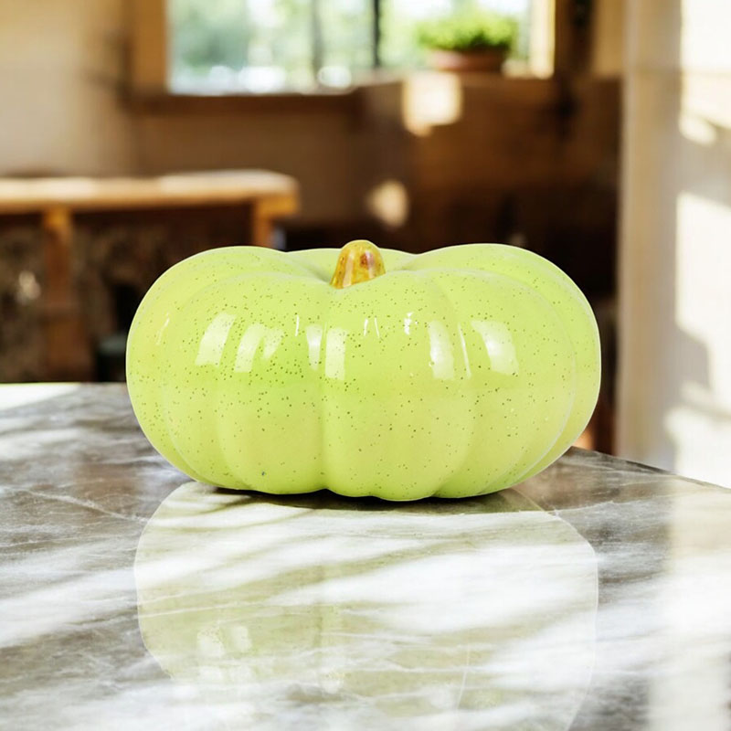 Este enfeite em formato de abóbora é feito de cerâmica de alta qualidade, que passou por um processo de esmaltação em forno de alta temperatura, garantindo durabilidade e um acabamento brilhante e sofisticado. Ideal para compor a decoração de ambientes modernos e tropicais, pode ser usada tanto como peça decorativa quanto funcional. Sua cor vibrante e seu design criativo trazem um toque de descontração e estilo à sua casa.