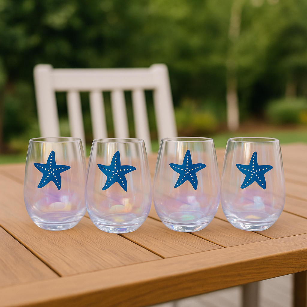 Conjunto com 4 copos de vidro com acabamento iridescente, decorados com estrela-do-mar azul em destaque. Perfeitos para compor uma mesa descontraída com toque praiano, combinam charme e originalidade para momentos especiais.